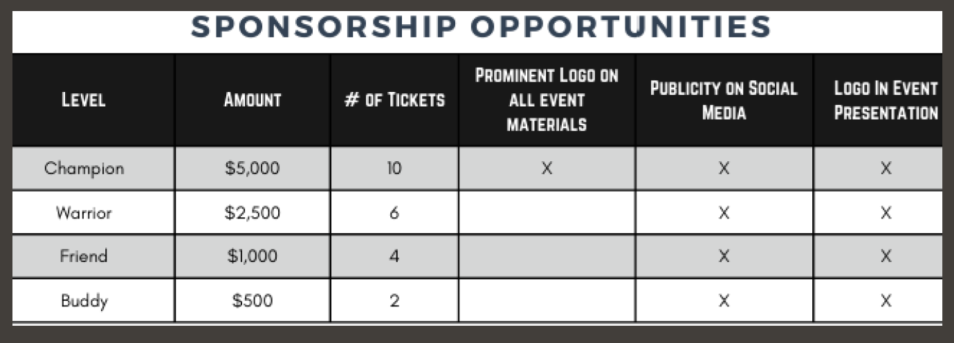 - $2,500.00 Sponsor level - WARRIOR
